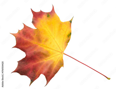 A leaf of a maple tree is shown in full color. The leaf is red and has a slightly brownish tint. The leaf is positioned on a white background, which makes the leaf stand out and appear more vibrant.