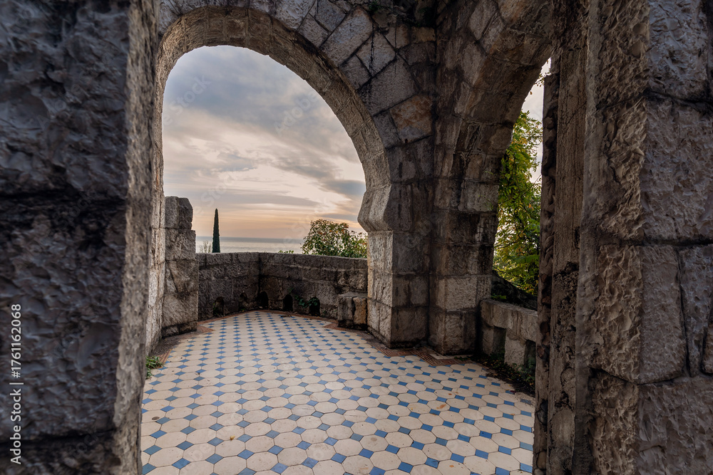 Stone archway framing scenic view with patterned floor and soft sunset lighting