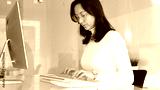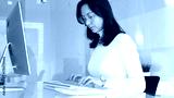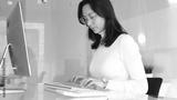 Woman wearing white casual sweater and glasses typing on computer keyboard in modern office, working on business project, sending emails, or data entry, focusing on digital tasks. Audit in business