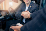 Young male in suit finalizing car purchase with handshake in dealership, sunlight