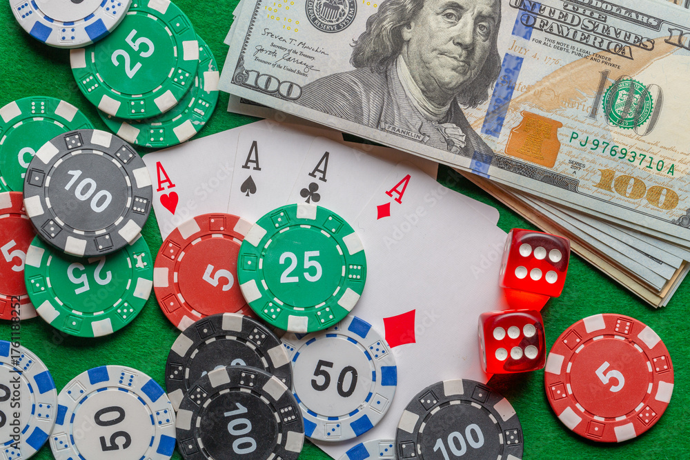 Casino, poker and gambling concept. Four aces with chips, dice and hundred dollar banknotes on the green casino table