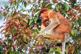 Proboscis monkeys or nasalis larvatus in Tanjung Puting National Park, Indonesia. Young Proboscis monkey child drinking breast milk. Kalimantan Borneo Island
