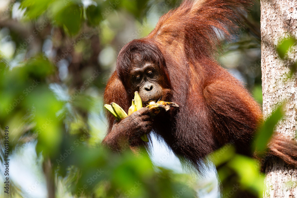 Orange Borneon orangutan Pongo pygmaeus eating bananas on a tree. Tanjung Puting National park, Indonesia
