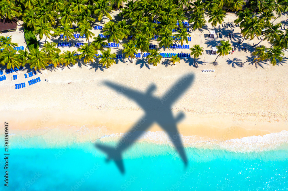 Beach vacation, air travel concept and travel background. Shadow of a airplane landing at stunning caribbean tropical island beach with palms. Saona, Dominican Republic. Vacation background.