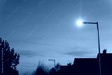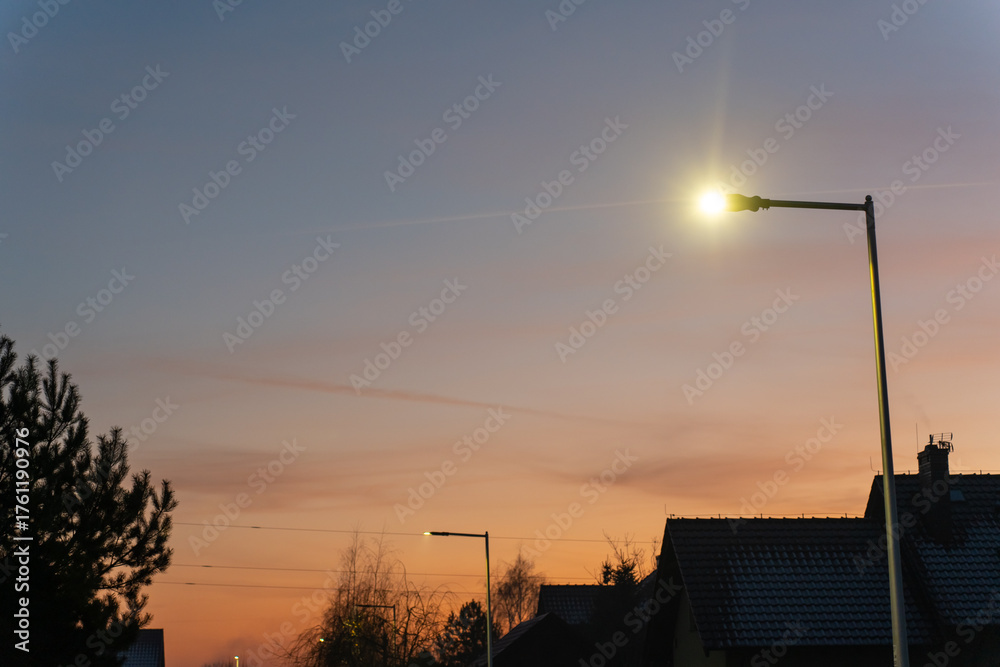 Dramatic evening sky with illuminated street lamp and silhouettes of residential houses during sunset twilight. Urban infrastructure and peaceful neighborhood atmosphere in winter concept.