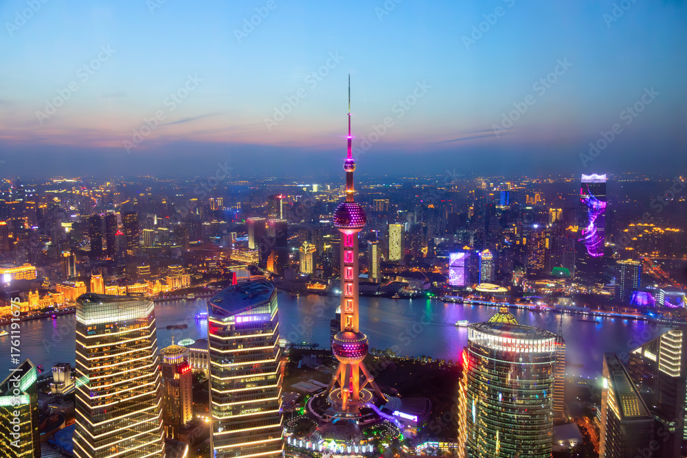 Aerial cityscape of Shanghai, China at sunset. Panoramic view of Pudong business district skyline from the skyscraper.