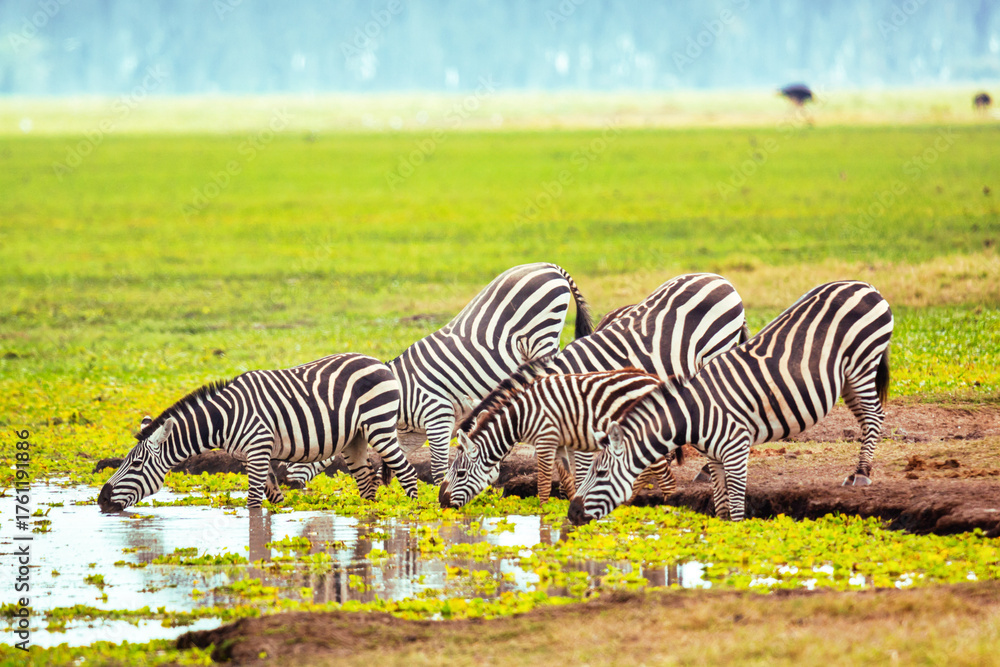 African landscape. Zebras drinking from a puddle in african savannah. Masai Mara national Reserve, Kenya