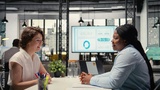 Female recruiter conducting interview with african american applicant, going through the hiring process by discussing job expectations, qualifications. Evaluating the resume in detail. Camera A.