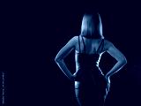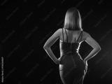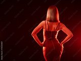 Fashion showcases woman in elegant evening dress posing with red light on dark background, concept of glamour, style and nightlife.