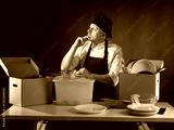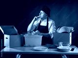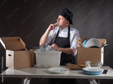 Chef in uniform and black apron sits at table with boxes of kitchenware, thoughtfully organizing dishes and utensils, symbolizing catering preparation and culinary work.