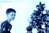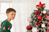 Happy little boy sits on dad shoulders, puts toys on tall festive Christmas tree. Dad and son decorate house together, prepare for New Year winter holidays celebration. High quality photo
