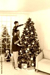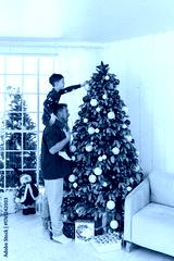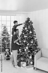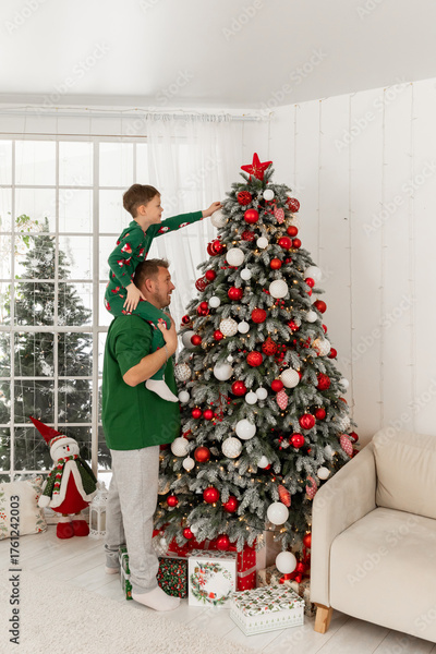 Father holds happy little boy on shoulders, helps to putt toys on tall festive Christmas tree. Dad and son decorate house together, prepare for New Year winter holidays celebration. High quality photo