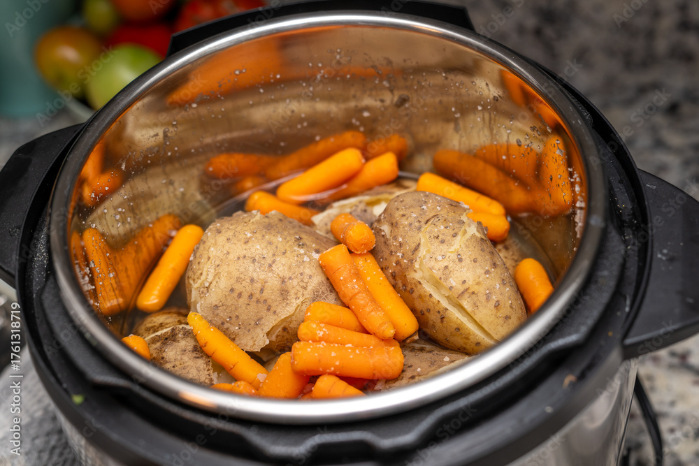Cooking stew in slow cooker. Potato and carrots in a slow cooker.