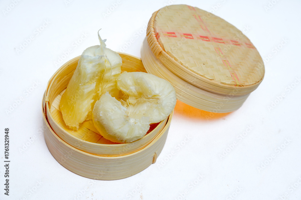 view of boiled cassava in a small open woven bamboo container isolated on white for advertising space. boiled cassava