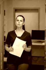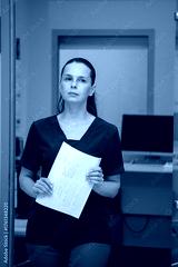 Healthcare Worker wearing blue scrub in medical clinic opens the door. Doctor holding Medical Report near her office opening the door