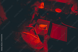 Man works on film black and white platinum print in laboratory.