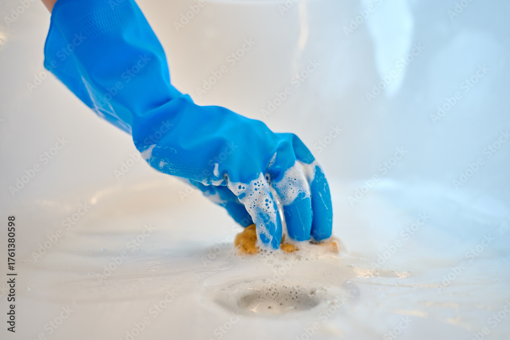 Person wearing blue rubber glove cleaning bathtub with sponge and soap in modern bathroom. foam during household chores. Concept of household chores, hygiene and cleanliness at home