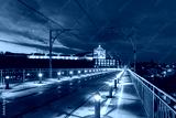 Empty tram rails on the Dom Luis I or Luiz I iron arch bridge across Douro river and Monastery of Serra of Pilar in Porto during morning blue hour, Portugal.