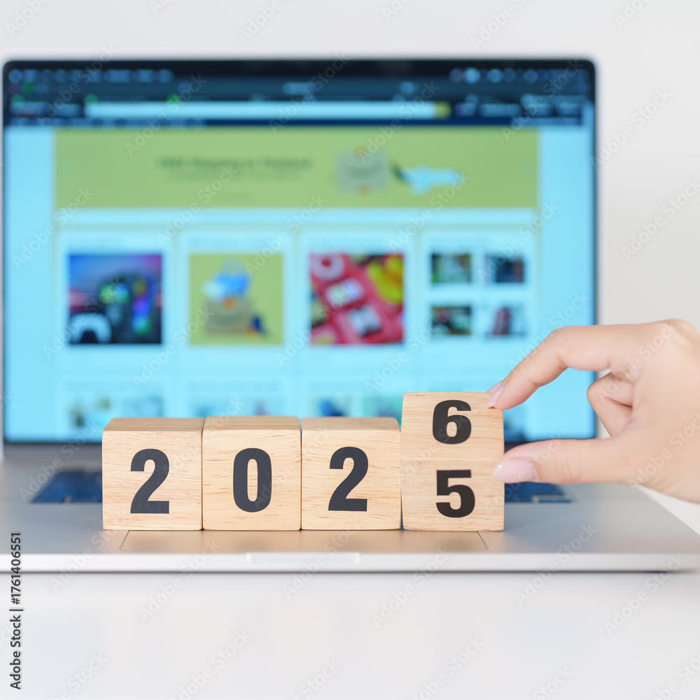 2025 end year to Happy New Year 2026 block against laptop background. Hiring, recruitment, job, Social Media, SEO, Search Engine Optimization and New Year concepts