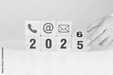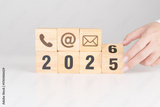 Happy New Year 2026 block for Contact Us concepts. Wood block of Email, call Phone and Website Address sign. For Customer support hotline, business Marketing, Corporate, communication and Advertising