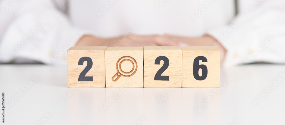 2026 year block with magnifying glass icon. SEO, Search Engine Optimization, hiring , Advertising, Idea, Strategy, marketing, Keyword, Content and New Year start concepts