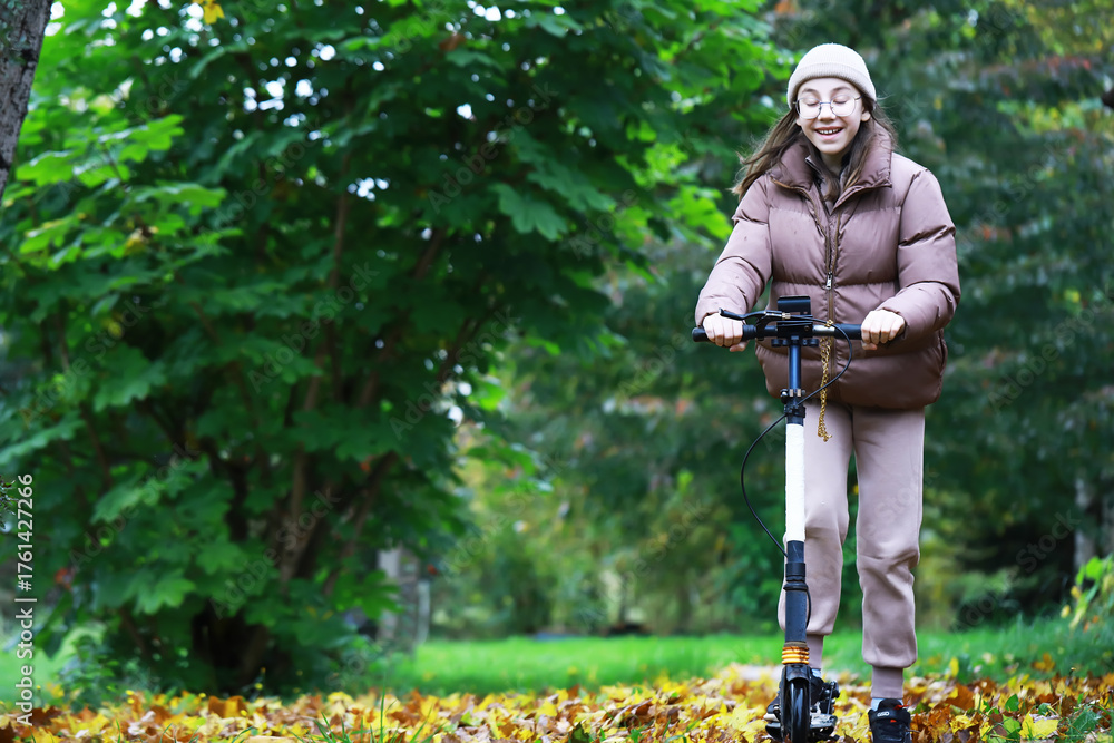 Smiling Woman Riding Electric Scooter in Autumn Park Surrounded by Trees and Fallen Leaves