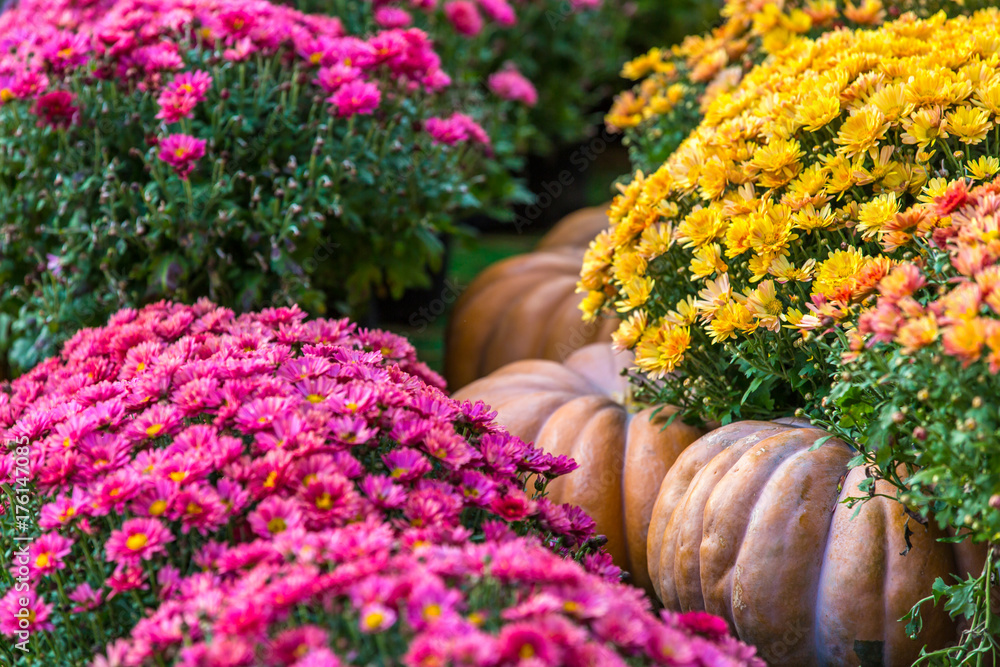 Yellow large pumpkins lie on the ground, between rows of red flowers - chrysanthemums. Colorful autumn in Moscow city, Russia.
