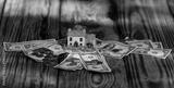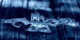 House purchase and mortgage concept with dollars. Real estate investment and property income. American home, rent, and financial planning. Realtor and apartment sale with mortgage and loan.