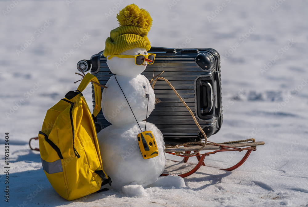 Winter holiday card with snowman and snowy background. Snowman holding gift on greeting card. Winter greeting card decorated with happy snowman. Snowman on Christmas postcard.