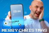 Excited man showing smartphone with Christmas sale notification in festive atmosphere