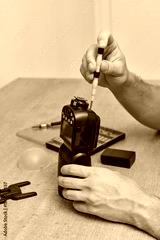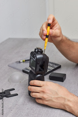 professional technician repairs a camera flash. Photographic equipment service. repairs photo flash, speedlight