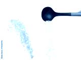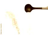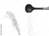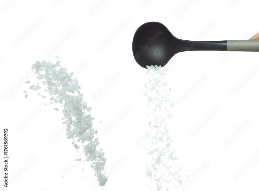 Salt rock flower pour fall in ladle, white Salt rock flower cook abstract cloud fly. Big size ground salt splash in air, food object element design. White background isolated high speed freeze motion