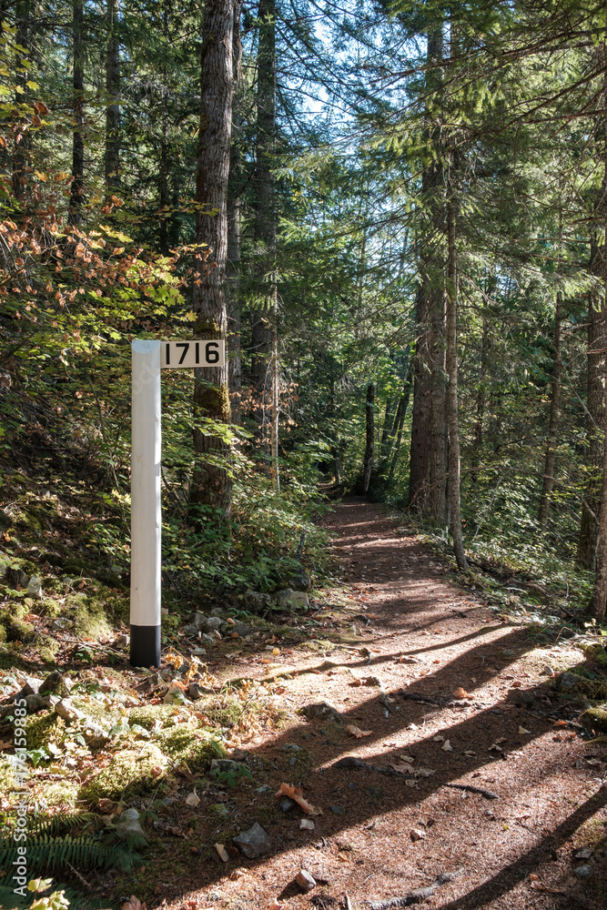 A milepost marker sits alongside a trail in the forest