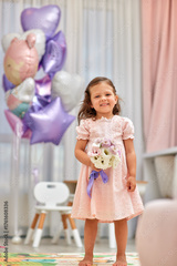 Cute little child girl in pink dress with flowers and pink purple balloons. Birthday concept.