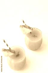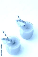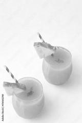 Two refreshing yellow tropical fruit drinks garnished with fruit slices and straws