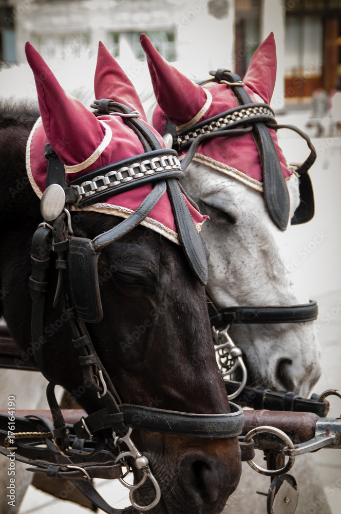 Fiakerpferde mit Kopfbedeckung