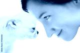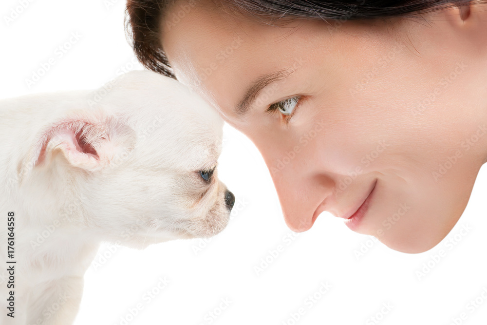 Smiling woman face to face with small white chihuahua puppy