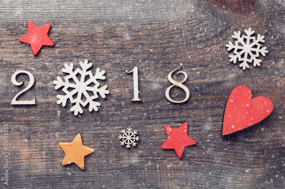 Happy New Year 2018 of real wooden figures with snowflakes and stars on wooden background with snow