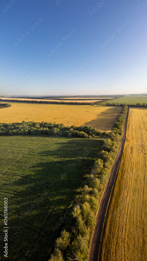 Aerial summer rural farmland vertical scenery with wheat agriculture fields and blue sky