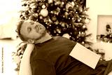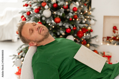 A tired man in green home t-shirt sleeps on an armchair in festive decorated living room near a Christmas tree with a book on his chest. Christmas morning concept. High quality photo