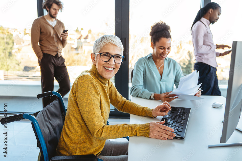 Business woman in wheelchair working with colleague in modern inclusive office. Diversity, support