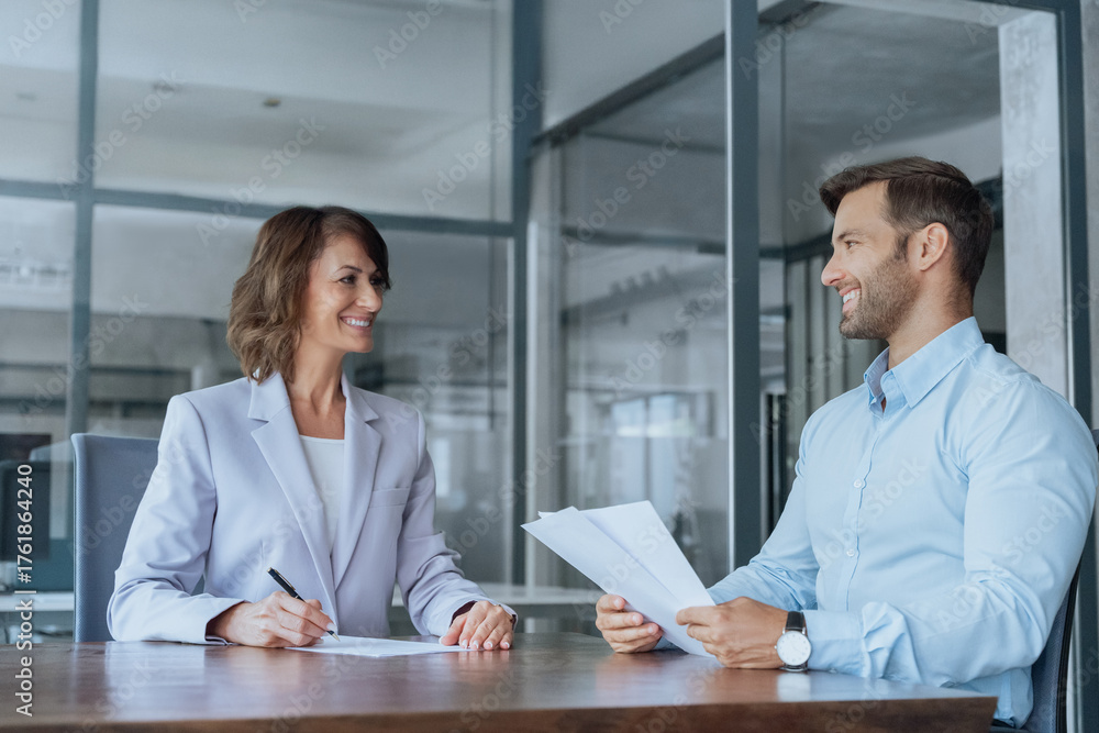 Mature woman client talking with young man bank real estate manager worker in office. Two business entrepreneur people sitting at table signing contract document at meeting, discussing cv on interview