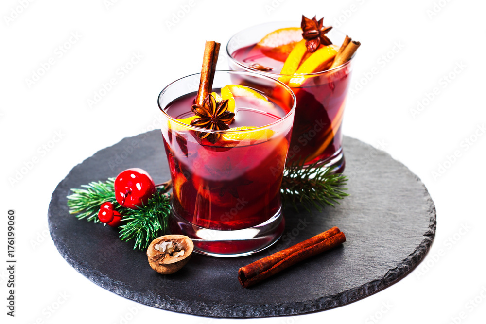 Christmas Hot mulled wine for winter with spices isolated on white background, traditional drink on winter holidays, closeup. board with Christmas Decorations