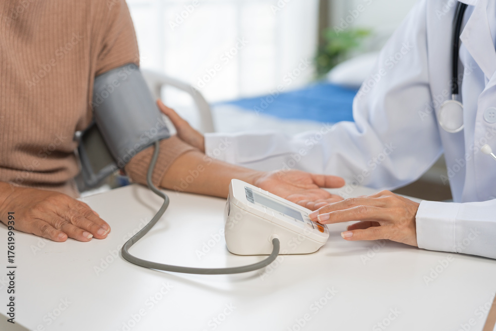 Doctor checking blood pressure for a senior patient, focusing on health, prevention, and regular medical checkup in a hospital