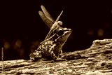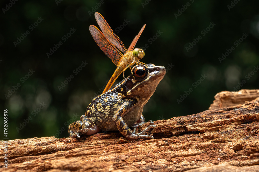 A spotted stream frog (Pulchrana signata) looks confused as a dragonfly lands on its head.