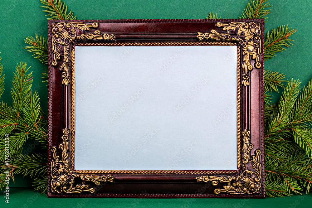 Mockup. Christmas. Ornate vintage picture frame features intricate detailing and blank space, surrounded by lush evergreen branches, creating festive atmosphere perfect for holiday decorations