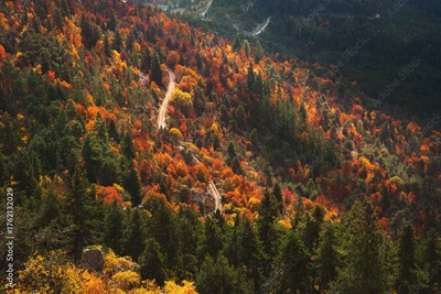 Winding Path Through a Colorful Autumn Forest – Aerial Scenic Landscape in Fall