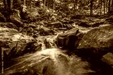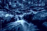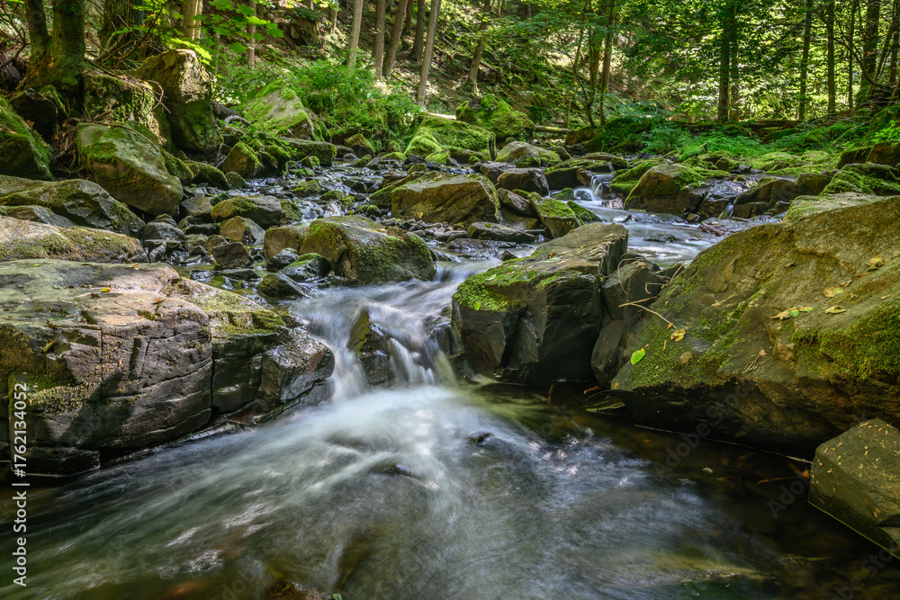 The picture shows a stream running through a forest that is filled with rocks and moss-covered boulders.