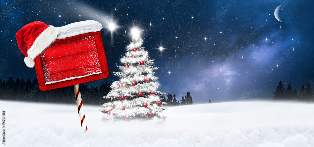 Weihnachtskarte mit Rotem Schild und Weihanchtsbaum