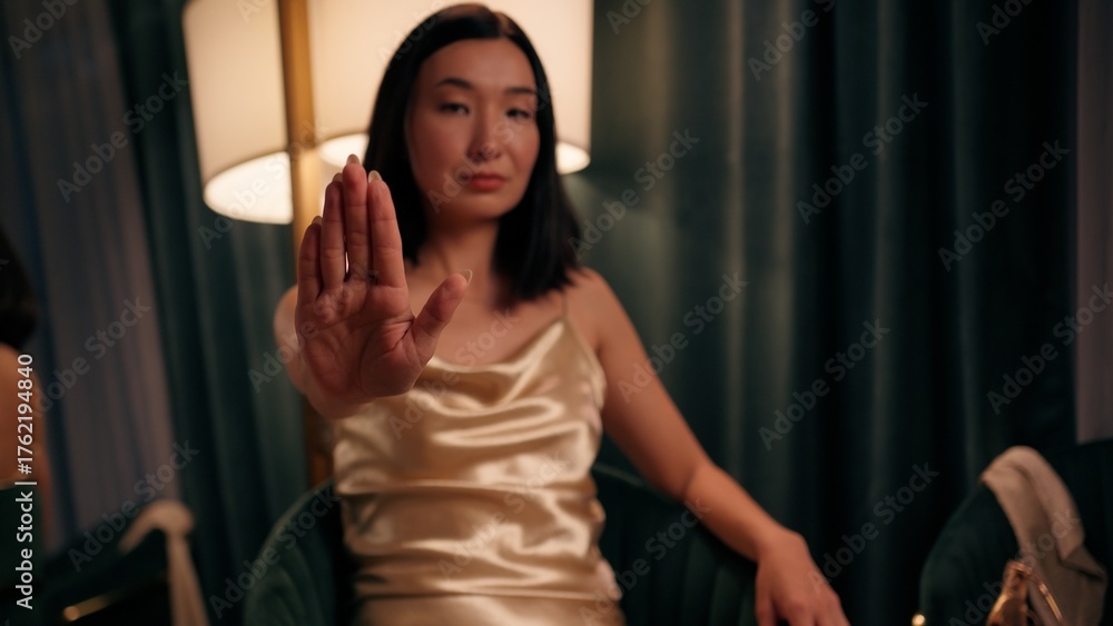 Asian woman Chinese female looking at camera stop gesture showing no not hand ban reject deny keep distance Korean lady Japanese indoors stylish fashionable model confidence negative stopping sign